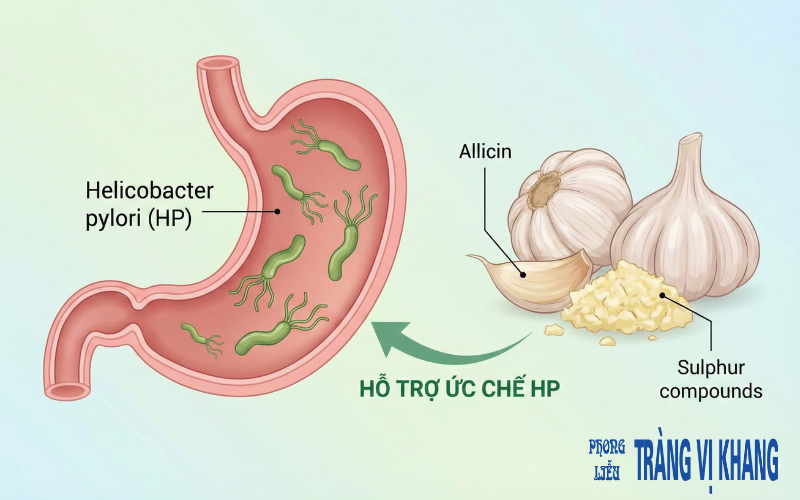 Tỏi chứa allicin, một hoạt chất kháng khuẩn tự nhiên mạnh. Nhiều nghiên cứu cho thấy tỏi có khả năng ức chế HP và hỗ trợ giảm viêm dạ dày.