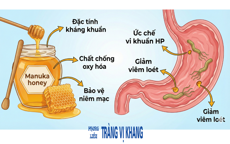 Mật ong có tính kháng khuẩn tự nhiên. Một số nghiên cứu cho thấy mật ong, đặc biệt là mật ong Manuka, có thể ức chế HP và hỗ trợ giảm viêm dạ dày.