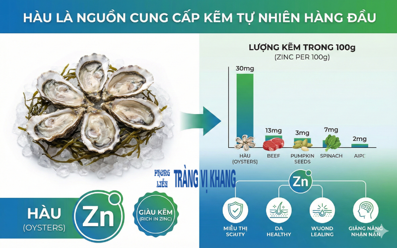 Hàu là thực phẩm giàu kẽm hàng đầu, với khả năng cung cấp lượng kẽm rất cao và dễ hấp thu. Ngoài ra, tôm, cua, cá biển cũng là nguồn kẽm tốt.