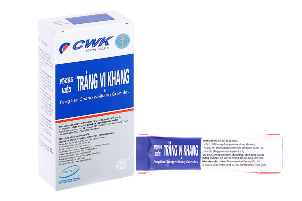 Thuốc cốm Phong Liễu Tràng Vị Khang là sản phẩm được sản xuất tại Haikou Pharmaceutical Factory Co., Ltd, chứa các thành phần thảo dược quý như dịch chiết Ngưu Nhĩ Phong (Daphyniphyllum calycinum Benth.) và dịch chiết La Liễu (Polygonum hydropiper L.). Sản phẩm có công dụng hỗ trợ điều trị viêm dạ dày, ruột cấp tính thể ỉa chảy do ngộ độc thực phẩm và thể ỉa chảy do thấp nhiệt. Ngoài ra, Tràng Vị Khang còn có thể sử dụng cho trường hợp đau dạ dày do tích trệ thức ăn, giúp giảm triệu chứng đầy bụng, khó tiêu, ợ hơi và đau thượng vị.