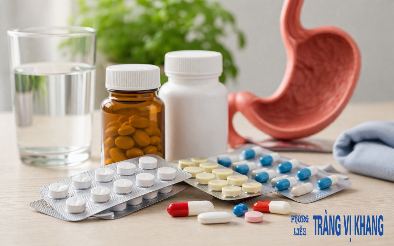 Nhóm thuốc dạ dày: Sử dụng thuốc ức chế bơm Proton (PPI) để giảm tiết acid, thuốc bọc niêm mạc và kháng sinh (nếu có HP).